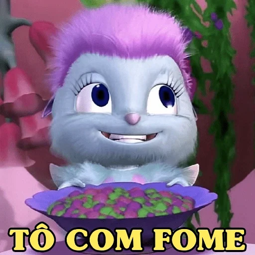 Um animal cinza com cabelo roxo e olhos grandes sorri enquanto segura uma tigela com comida colorida. Abaixo dele, está escrito 'Tô com fome'.