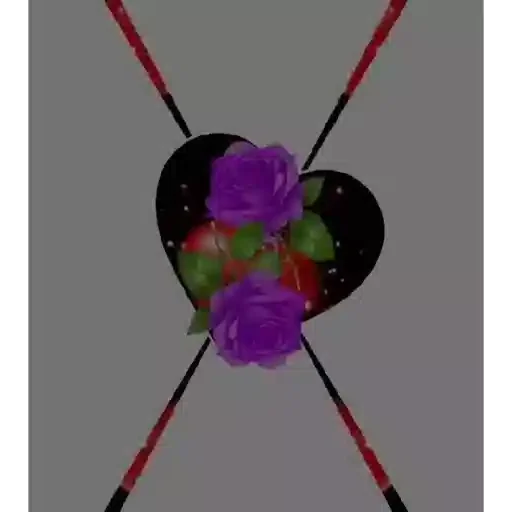 Um coração preto com rosas roxas e vermelhas no centro, com linhas diagonais vermelhas e pretas ao fundo.