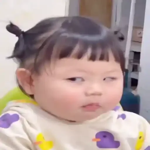 Um bebê com franja e cabelos presos em dois coques, vestindo uma camisa branca com patos roxos e amarelos.