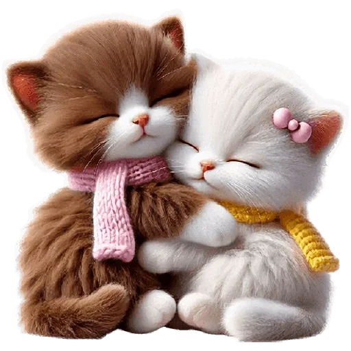 Dois gatinhos fofos, um castanho e um branco, abraçados e dormindo. O gato castanho usa um cachecol rosa e o branco um amarelo.