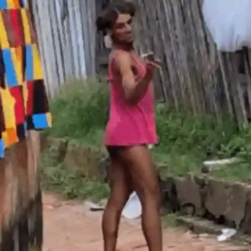 Mulher negra com cabelo preto em um coque, vestindo uma blusa rosa e shorts, fazendo um gesto com a mão em um ambiente ao ar livre com uma cerca de madeira ao fundo.