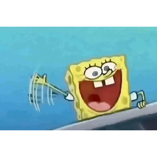 Bob Esponja com expressão de surpresa e alegria, mostrando os dentes e com as mãos para fora da água.