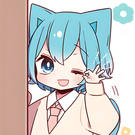 Uma menina de anime com cabelo azul e orelhas de gato, vestindo um suéter bege e gravata rosa, com estrelas amarelas ao…