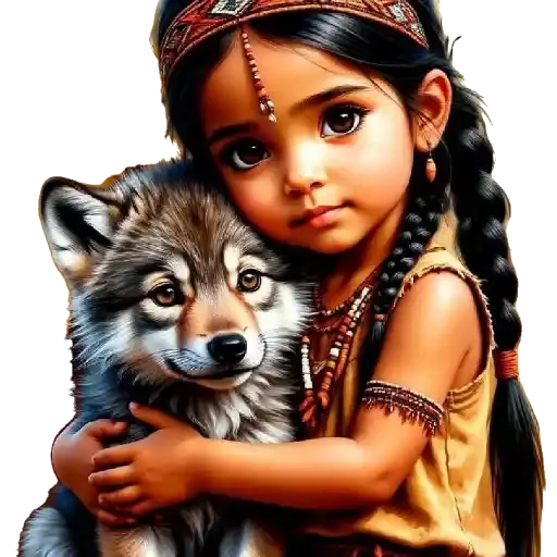 Uma menina indígena abraçando um lobo, ambos com expressões suaves. A menina usa um colar e uma tiara com detalhes em vermelho e azul.
