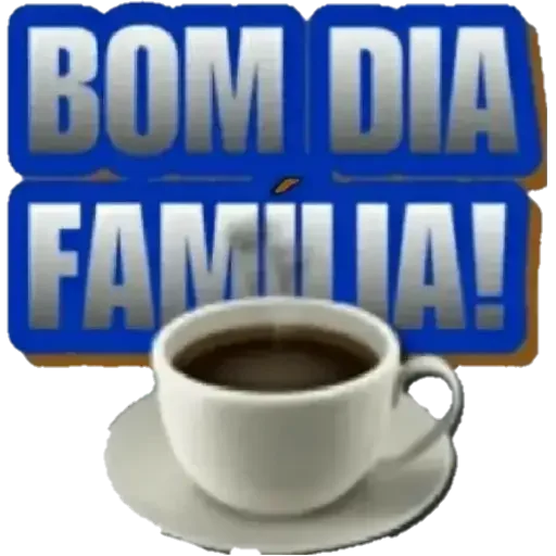 Uma xícara de café com a frase 'BOM DIA FAMÍLIA!' em letras grandes e azuis.