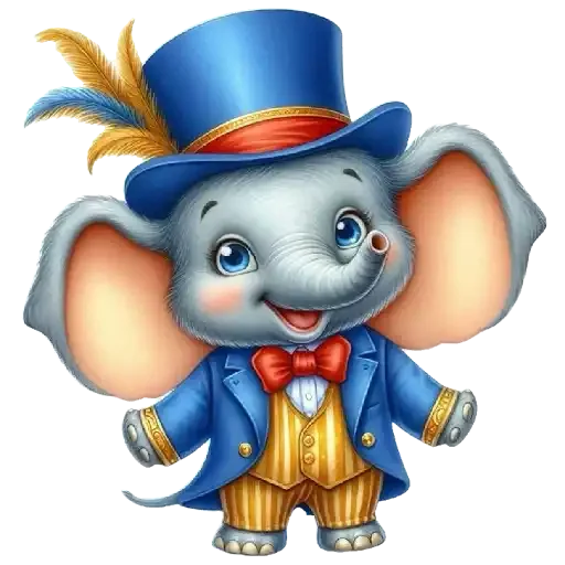 Um elefante cartoon vestido com um chapéu azul, casaco azul, gravata vermelha e calças amarelas.