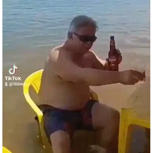 Homem de meia-idade, sem camisa, com sunga preta, óculos escuros, segurando uma garrafa de cerveja, sentado em uma cadeira amarela na praia.