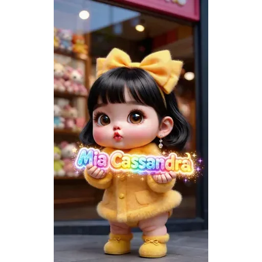 Menina de cabelo preto com franja e um laço amarelo na cabeça, vestindo um casaco amarelo, segura uma placa colorida…