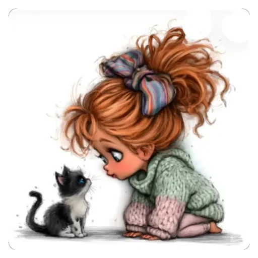 Menina com cabelo ruivo e um laço colorido olha para um gatinho preto e branco.