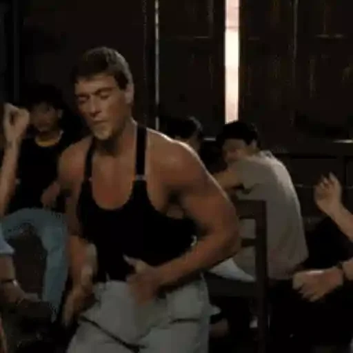 Homem musculoso com tanque preto e calça cinza, com expressão de raiva ou dor, em um ambiente escuro com outras pessoas ao fundo.