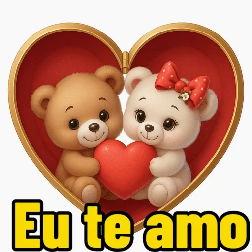 Dois ursinhos de pelúcia, um marrom e um branco com laço rosa, sentados dentro de um coração vermelho com uma borda dourada, com o texto 'Eu te amo' em amarelo.