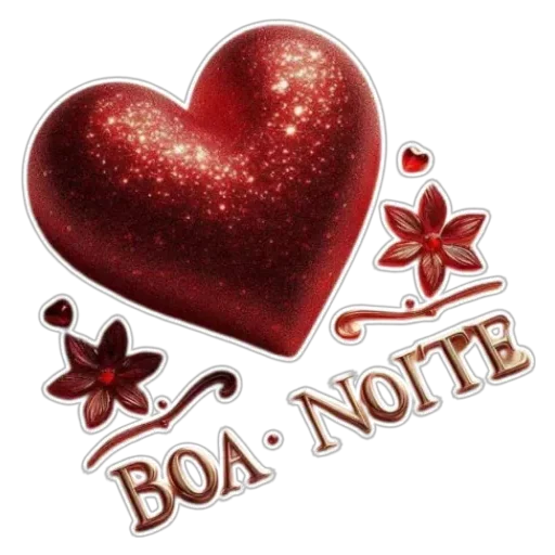 Um coração vermelho brilhante com glitter, acompanhado de flores e a frase 'BOA NOITE' em letras douradas.
