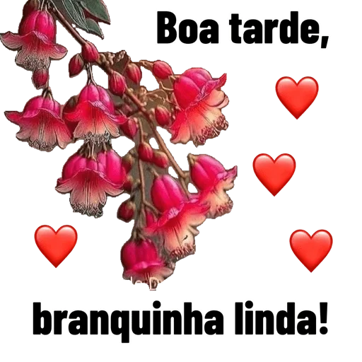 Um ramo de flores rosadas com folhas verdes e vários corações vermelhos ao redor, com o texto 'Boa tarde, branquinha linda!'