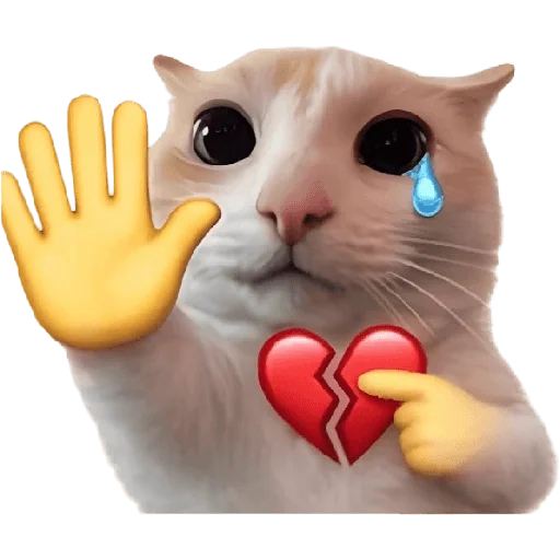Gato com olhos arregalados e lágrima no rosto, com uma mão levantada e outra apontando para um coração partido vermelho no peito.