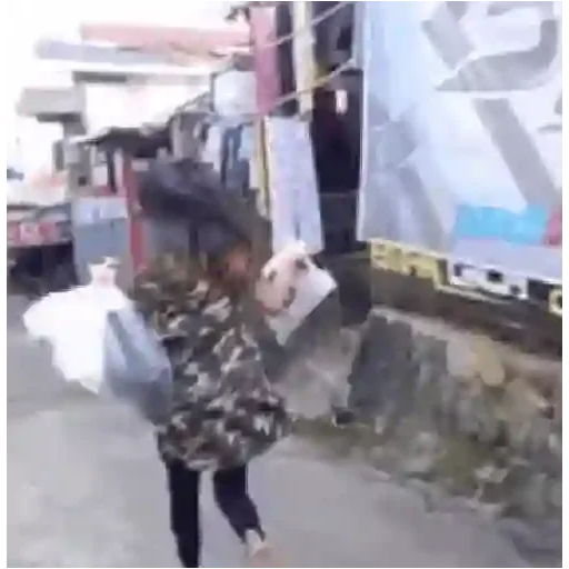 Uma mulher carregando sacos de compras na rua, com prédios ao fundo.