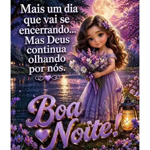 Uma menina com cabelo castanho e vestido roxo segura um buquê de flores à beira de um lago ao pôr do sol, com o texto 'Mais um dia que vai se encerrando... Mas Deus continua olhando por nós. Boa Noite!'