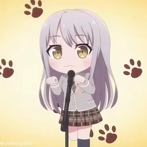 Uma menina de anime com cabelo roxo claro e olhos amarelos fala ao microfone, vestindo um suéter cinza e saia xadrez, com pegadas marrons ao redor.