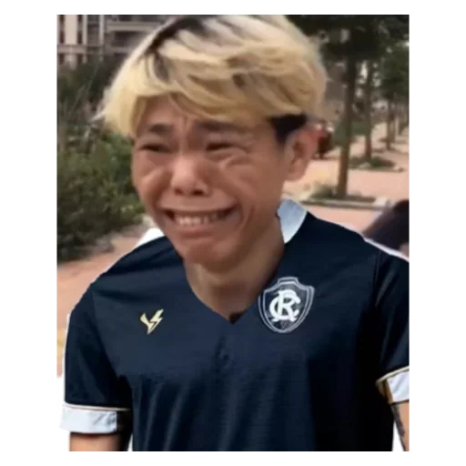 Um jovem com cabelo loiro e um sorriso largo, vestindo uma camisa de futebol azul escura com um logotipo de uma estrela no peito.