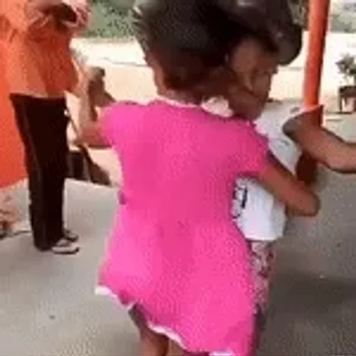 Uma menina de vestido rosa e um menino de boné e camisa branca dançando juntos.