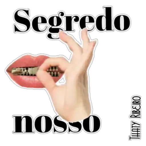 Uma mão segurando um segredo entre os dedos, com uma boca ao fundo. O texto 'Segredo nosso' está escrito em preto.