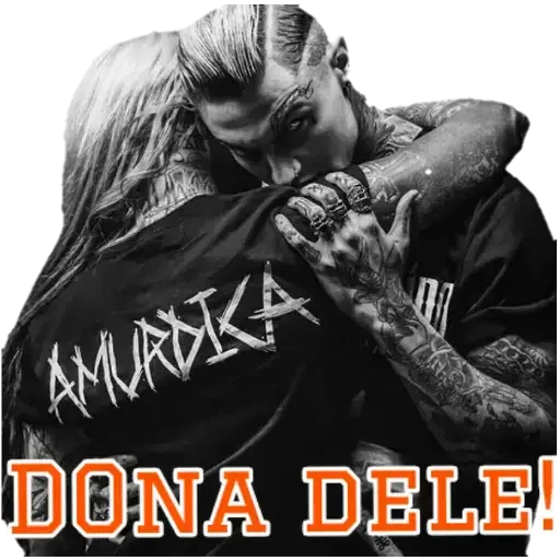 Um casal se abraçando, com o homem tendo tatuagens no braço e a mulher com o cabelo loiro e o texto 'AMURDICA' na camisa. Abaixo deles, o texto 'DONA DELE!' em laranja.