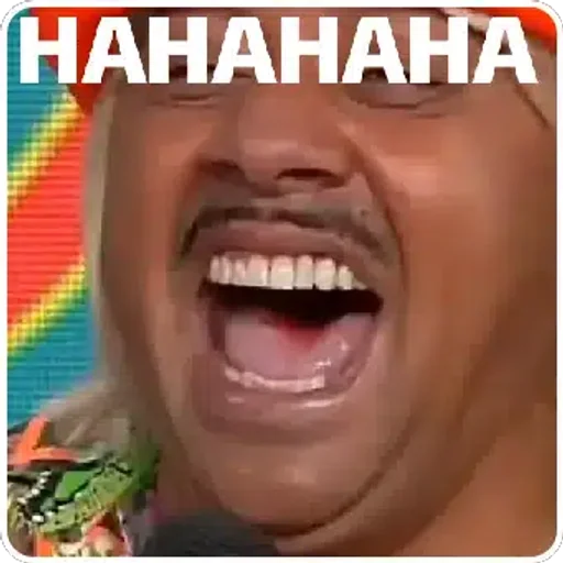 Rosto de uma pessoa com a boca aberta e dentes aparecendo, com a palavra 'HAHAHAHA' em letras grandes e brancas em cima. Fundo colorido pixelado.