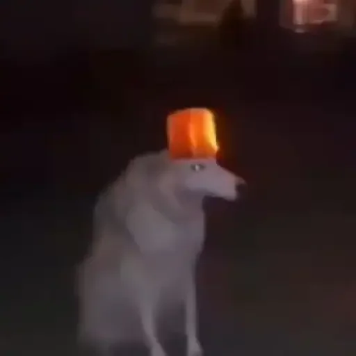 Cachorro branco usando um balde laranja na cabeça em um ambiente escuro.