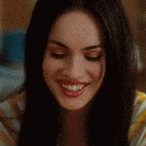 Mulher com cabelo preto e sorriso largo, olhos fechados, maquiagem colorida e camisa listrada.