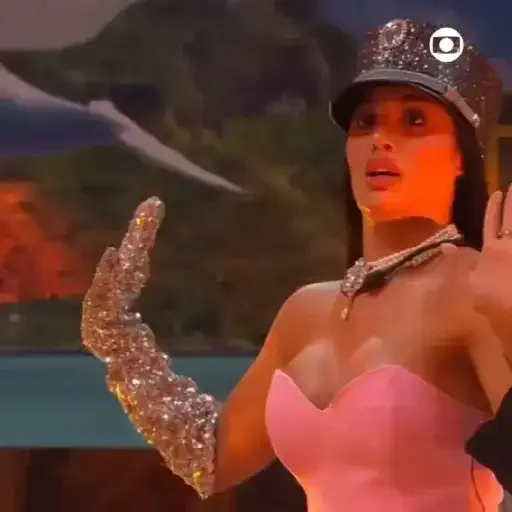 Uma mulher loira com um chapéu de policial e um vestido rosa, com uma luva brilhante, fazendo um gesto com a mão.