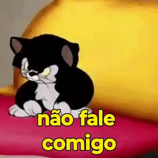 Um gato preto e branco de desenho animado com expressão de descontentamento, sentado em uma superfície vermelha com um fundo amarelo. Abaixo dele, está escrito 'não fale comigo' em amarelo.