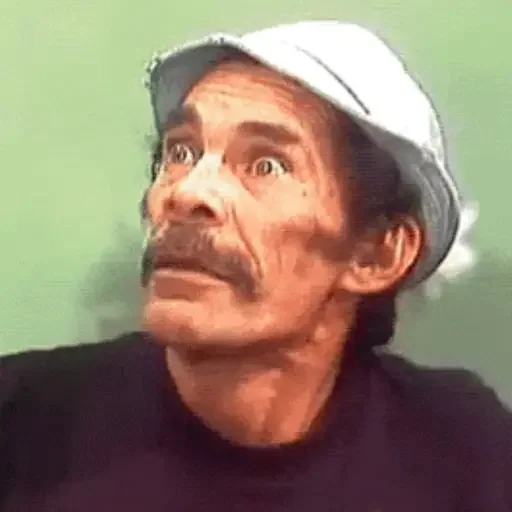 Homem com bigode e chapéu branco olhando para cima com expressão surpresa, vestindo uma camisa preta.