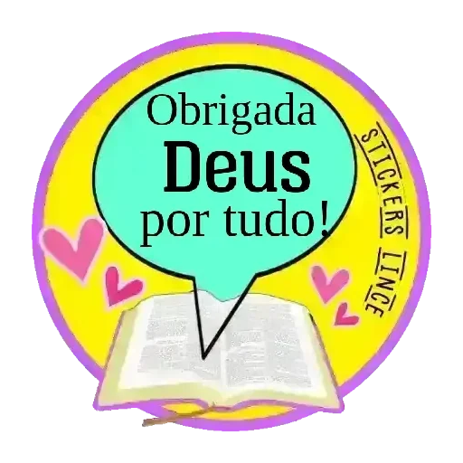 Uma figurinha com um livro aberto e uma bolha de fala com o texto 'Obrigada Deus por tudo!' em preto, sobre um fundo amarelo com corações rosa e uma borda roxa.