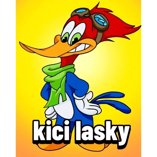 Um pato cartoon com óculos de goggles, lenço verde e roupa azul, com o texto 'kici lasky' embaixo.