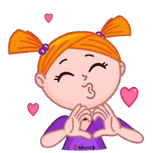 Menina de cabelos laranjas em coque duplo com as mãos unidas em frente ao rosto e olhos fechados, rodeada de corações rosa. Ela parece sonhar ou rezar.