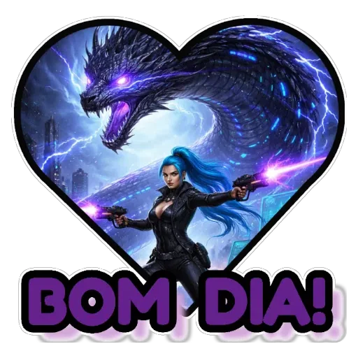 Uma mulher com cabelo azul e um traje preto está em pé com os braços estendidos, com uma luz roxa saindo de suas mãos. Ela está diante de um dragão roxo com olhos roxos dentro de um coração, com raios azuis ao fundo. Abaixo, está escrito 'BOM DIA!' em letras roxas.