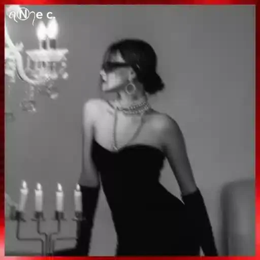 Mulher elegante em vestido preto ao lado de um candelabro, com um lustre ao fundo. Ela está usando um colar e pulseiras.