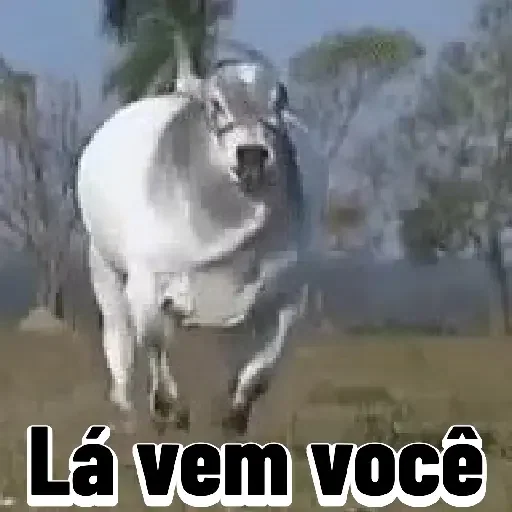 Um touro branco correndo em um campo com árvores ao fundo. Abaixo dele, está escrito 'Lá vem você'.