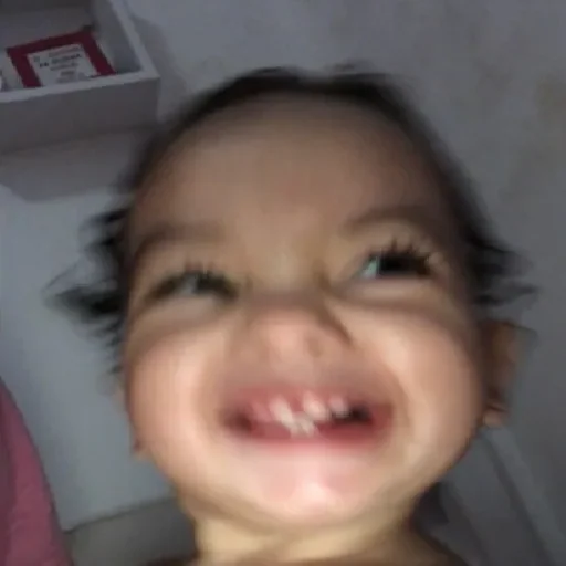 Rosto de bebê com sorriso largo e dentes de leite aparentes, fundo cinza e caixa no canto superior esquerdo.