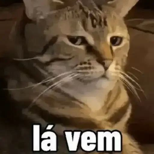 Gato com expressão séria e olhar penetrante, sobreposto por outro gato, com texto 'lá vem' embaixo.