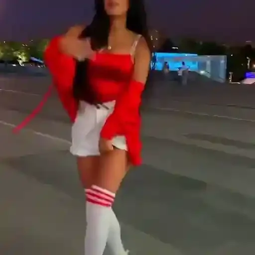 Mulher jovem dançando à noite, vestindo uma blusa vermelha, shorts brancos e meias altas com listras vermelhas.