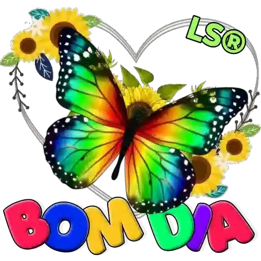 Uma borboleta colorida com asas verdes, azuis, amarelas e laranjas está no centro de um coração, cercada por girassóis e folhas. Abaixo, a frase 'BOM DIA' em letras coloridas.