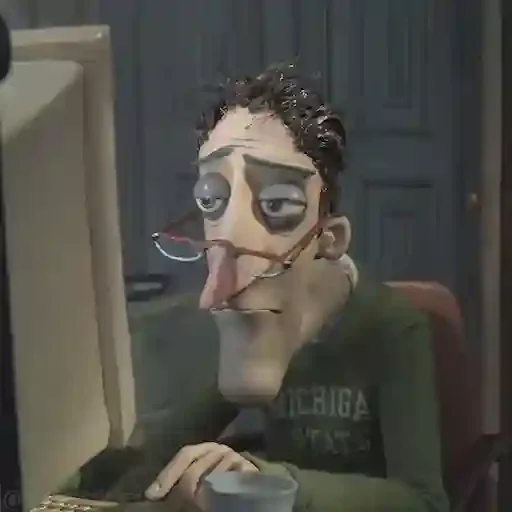 Um homem com expressão de surpresa e confusão ao olhar para a tela do computador, com um nariz grande e óculos.