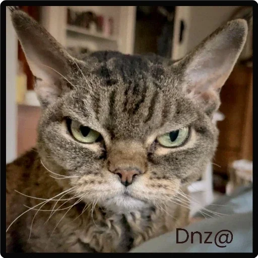 Gato cinza com olhos verdes e orelhas grandes, parecendo irritado ou desapontado. Fundo desfocado com móveis.