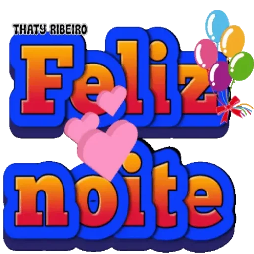 Um cartão de 'Feliz noite' com letras grandes coloridas, corações rosa e balões coloridos. O texto 'THATU.RIBEIRO' aparece no canto superior esquerdo.