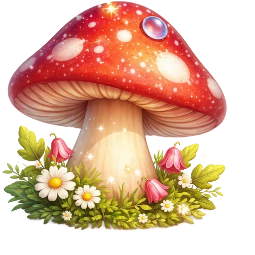Um cogumelo vermelho com manchas brancas e um brilho roxo em cima, cercado por flores e folhagem verde.