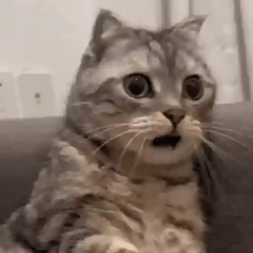Gato cinza com olhos arregalados e boca aberta, parecendo surpreso ou assustado.
