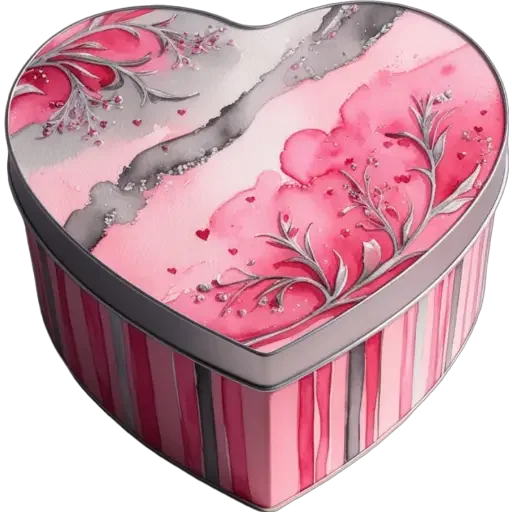 Uma caixa em forma de coração rosa com flores e listras, tampa decorada com pintura floral.