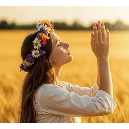 Mulher com coroa de flores no cabelo, mãos levantadas em um campo de trigo ao pôr do sol.