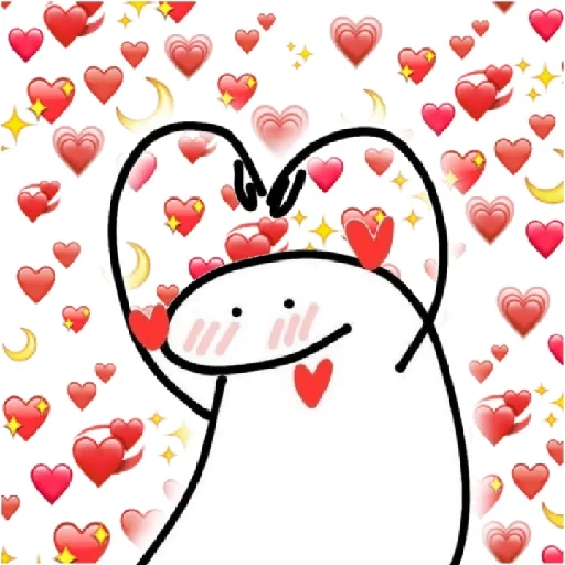 Um desenho simples de um personagem com um sorriso e um gesto de timidez, cercado por muitos corações vermelhos.