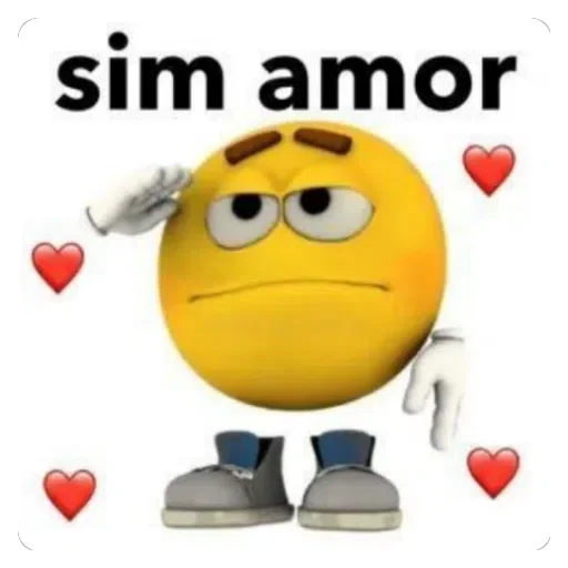 Um emoji amarelo com expressão de desconfiança, texto 'sim amor' em preto, rodeado de corações vermelhos.